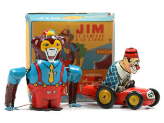 longueur 12 cm - moteur à clef (fonctionne) - en action, la voiture tourne en rond tandis que le personnage oscille d'avant en arrière & fait se cabrer l'avant du véhicule par son poids - manque un bras