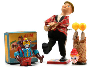 hauteur 27 cm - moteur à ressort (fonctionne) - en action, le trompettiste remue en avant & en arrière sur sa jambe gauche, fait bouger sa tête tandis que son chapeau se soulève - manque fixation de la trompette à la bouche - vêtements poussiéreux
