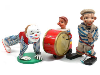 états de 'B' à 'D' - comprend un pêcheur à la ligne (incomplète & oxydée) avec système de câble pour le fonctionnement (vêtements tachés & poussiéreux), un clown équilibriste & un clown joueur de grosse caisse (moteur à revoir & petits manques) - on y retrouve les marques : DAIYA, ASS & H.Z.