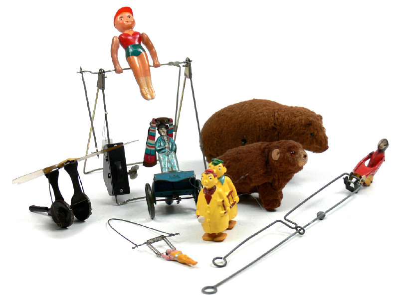 états de 'B' à 'D' - comprend 3 gymnastes dont un singe, 2 ours mécaniques, un papillon, un personnage avec hélice sur la tête & 2 peintres en tandem - 3 modèles avec mécanismes fonctionnant - un élément incomplet - quelques traces d'oxydation - un modèle de la marque RICO & un autre de la marque KFS