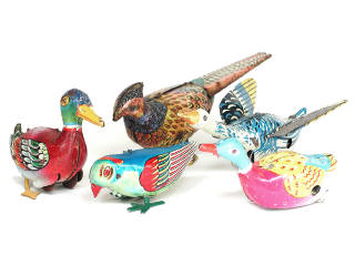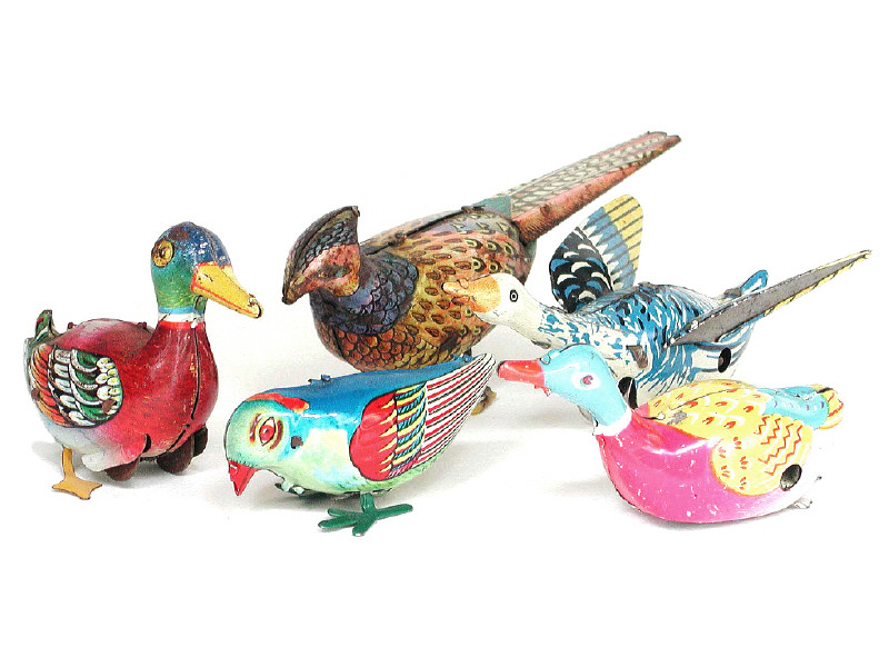 états de 'B' à 'C' - réalisations en tôle avec moteur mécanique ou à friction (4 fonctionnent) - comprend 2 oiseaux & 3 canards - manque une patte - une patte partiellement cassée - quelques traces d'oxydation