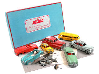 états de 'D' à 'F' - on y joint un coffret vide (en état 'c') avec cale de présentation, notice & différents accessoires ainsi qu'une voiture en tôle lithographiée de la marque JOUSTRA en état 'D'
