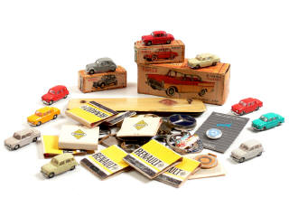série 'MICRO MINIATURES' - états de 'B' à 'C' - miniatures reproduisant les modèles : CITROËN & RENAULT - 2 véhicules en boîte - on y joint une boîte vide de la marque (référence 40) en état 'c', 9 porte-clefs, 2 pin's & 9 étuis d'allumettes RENAULT