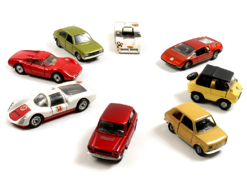 états de 'B' à 'D' - miniatures reproduisant les modèles : ALFA ROMEO, AUTOBIANCHI, CHAPARRAL, FERRARI, FERVES, FIAT, ITAL DESIGN & PORSCHE (en état 'F') - on y retrouve les marques : MERCURY & MEBETOYS