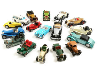 miniatures reproduisant notamment les modèles : BUGATTI, LAGONDA, MERCEDES, MG, RILEY, JAGUAR, HISPANO SUIZA, AUBURN, STUTZ, ROLLS ROYCE, RENAULT, ALFA ROMEO & MORRIS - on y retrouve notamment les marques : MATCHBOX, NEW RAY & WELLY