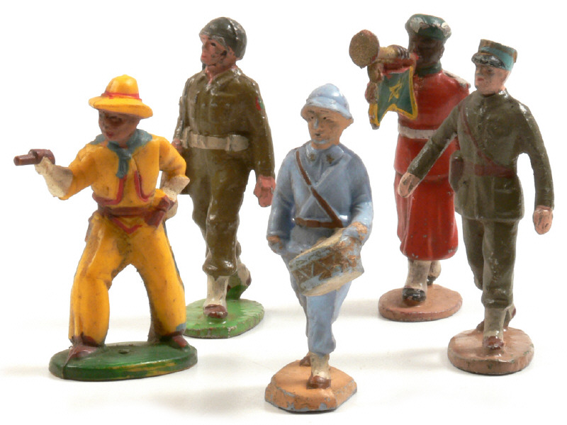 comprend : un soldat de la Garde Noire du Maroc avec clairon, un fantassin avec fusil à la bretelle & un officier au défilé - on y joint un tambour & un cowboy de marques indéterminées