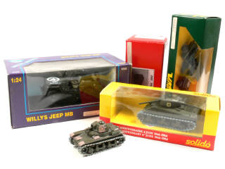 comprend : 2 JEEP, un char SHERMAN & un char RENAULT R35 (parties repeintes & sans boîte) - on y retrouve les marques : GONIO, SOLIDO & VEREM - on y joint un kit à monter de MERCEDES G4 (semble complet)