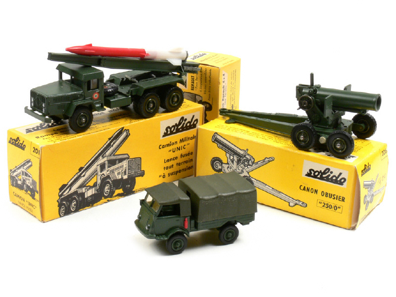 comprend : un RENAULT 4x4 (boîte en état 'd'), UNIC lance-fusée (jantes légèrement fondues & quelques petites parties ternies) & OBUSIER 250/0