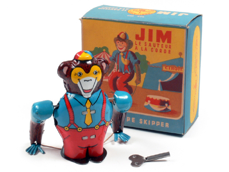 JOUSTRA (FRANCE) 1015 JIM, le singe sauteur à la corde en tôle lithographiée rouge & bleu