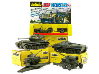 SOLIDO (FRANCE) Ensemble de 3 véhicules militaires, une remorque & 2 canons kaki