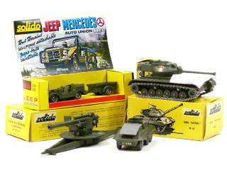 SOLIDO (FRANCE) Ensemble de 3 véhicules militaires, une remorque & un canon kaki