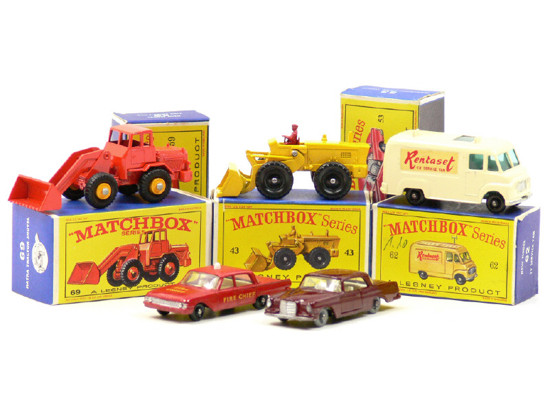 on y retrouve les modèles : AVELING BARFORD (n°43), COMMER (n°62, avec accessoires), MERCEDES (n°53), FORD (n°59) & HATRA (n°69) - 3 boîtes avec petites annotations dont une en état 'c'
