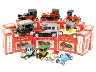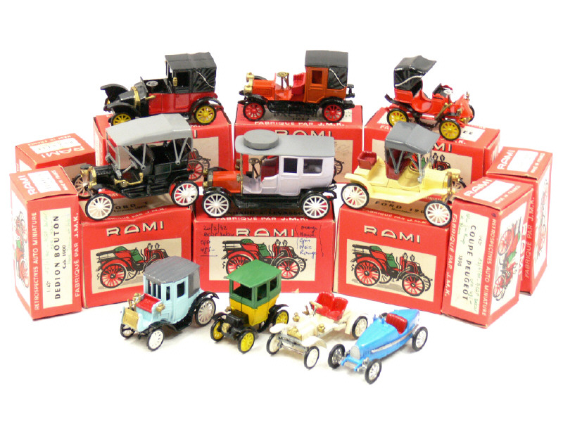 miniatures reproduisant les modèles : BUGATTI, DEDION BOUTON, FORD, GOBRON BRILLIE, PACKARD, PANHARD & LEVASSOR, PEUGEOT, RENAULT & SIZAIRE & NAUDIN - petites annotations sur les boîtes dont 2 en état 'c' - quelques manques