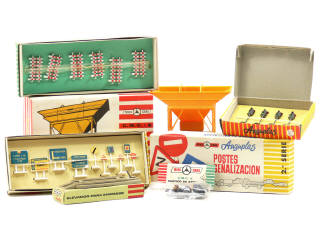 comprend : une trémie à sable, 2 coffrets de 10 panneaux de signalisation, un de 6 barrières, un de 4 feux tricolores, un pont élévateur & un sachet contenant des fûts, des tonneaux & des jerricans - avec 2 dépliants présentant les modèles de la marque
