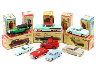 échelle 1/86ème - miniatures reproduisant les modèles : FIAT, FORD, JAGUAR, LAND ROVER, ROLLS ROYCE, ROVER, STUDEBAKER & VOLVO - quelques carrosseries légèrement déformées - une boîte en état 'c' & une autre avec petites annotations