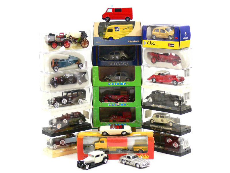 miniatures reproduisant les modèles : BUGATTI, CADILLAC, CITROËN, DUESENBERG, DEDION BOUTON, FACEL VEGA, LEYAT, MERCEDES, RENAULT, ROLLS ROYCE, UNIC & VOISIN - on y retrouve notamment les marques : ELIGOR, RIO, BBURAGO & SOLIDO - un véhicule sans boîte - une boîte en état 'd' - quelques petits manques