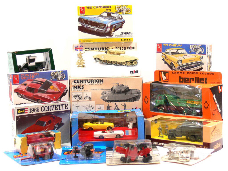 miniatures reproduisant notamment les modèles : PEUGEOT, RENAULT, LADA, CHEVROLET, BERLIET, GMC, CENTURION, KNUDSON, AGCO ALLIS, VERSATILE & WHITE - on y retrouve notamment les marques : VEREM, MATCHBOX, AMT, REVELL, LBS, SOLIDO, VALU-CAST, POLISTIL & ERTL - 2 voitures regroupées dans un coffret & 4 autres sous forme de maquettes jamais montées (dont une avec boîte sous film plastique jamais ouvert) - 4 engins agricoles sous blister jamais déballés - quelques boîtes en état 'c'