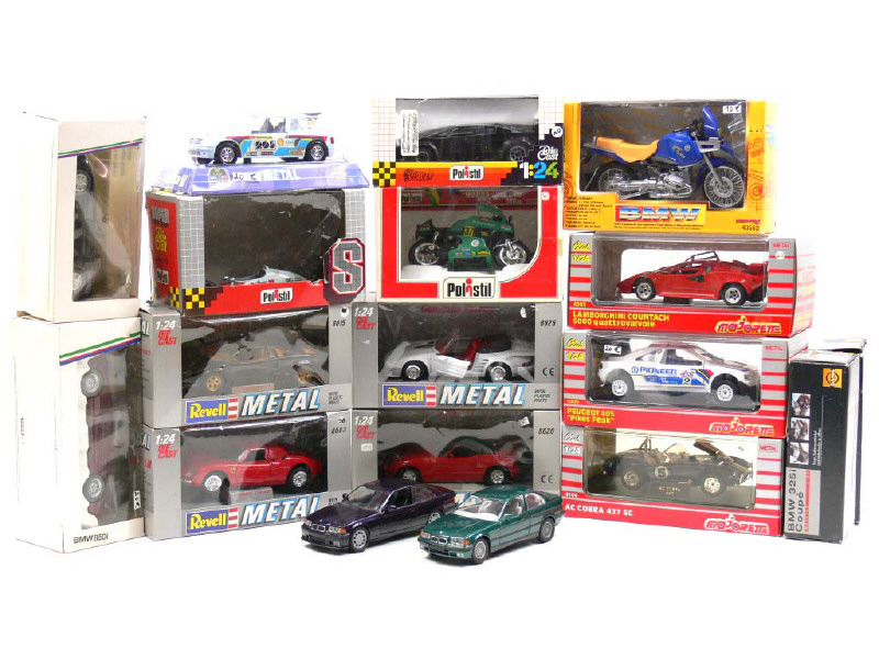 échelles 1/24ème - miniatures reproduisant les modèles : BMW, AC, PORSCHE, FERRARI, LAMBORGHINI, PEUGEOT, HONDA & Mc LAREN - on y retrouve les marques : MAJORETTE, GAMA, MIRA, NEW-RAY, POLISTIL, REVELL & SCHABAK - une boîte en état 'd'