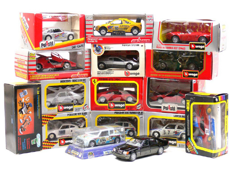 échelles 1/24ème - miniatures reproduisant les modèles : FERRARI, LAMBORGHINI, LANCIA, MERCEDES, PEUGEOT, FORD, JAGUAR & PORSCHE - on y retrouve les marques : BBURAGO, MIRA, POLISTIL, MAJORETTE & SCHABAK