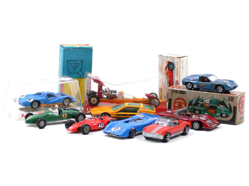 miniatures reproduisant notamment les modèles : COOPER, FERRARI, LOTUS, LAMBORGHINI, MATRA & PORSCHE - on y retrouve les marques : FARACARS, MEBETOYS & POLITOYS - 4 véhicules sans boîte