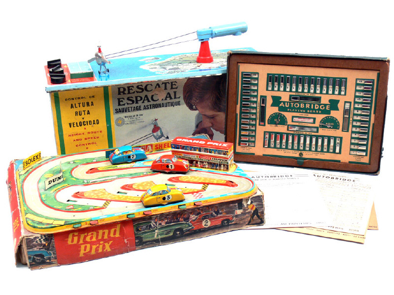 dimensions : 50 x 35 x 7 cm - avec 3 voitures de course - quelques traces d'oxydation sous le circuit - on y joint un jeu 'AUTOBRIDGE' en état 'A.d'