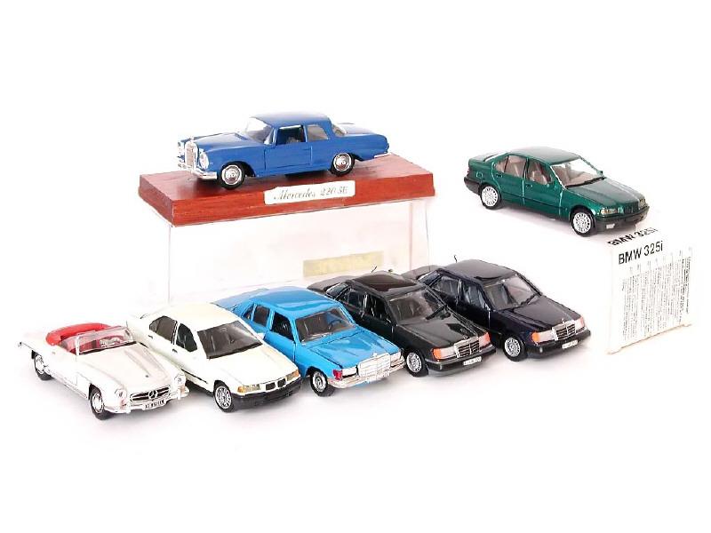 miniatures reproduisant les modèles : MERCEDES & BMW - on y retrouve les marques : VEREM, MINICHAMPS, SCHUCO & SOLID0 - manque 2 rétroviseurs - 2 véhicules avec boîte