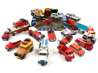 miniatures reproduisant notamment les modèles : FORD, JAGUAR, MG, MERCEDES, LADA, JEEP, TOYOTA, SIMCA, SAVIEM & VOLVO - on y retrouve notamment les marques : CORGI TOYS, SOLIDO, MAJORETTE, MATCHBOX, BRITAINS & SIKU - petits manques - l'hélicoptère est en boîte (état 'c')
