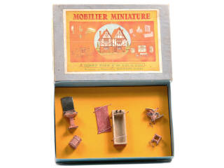 série 'MOBILIER MINIATURE' - fabrication de 1936 - comprend : baignoire, tapis en caoutchouc, lavabo avec miroir, panier à linge, WC & tabouret - manque la chasse d'eau des WC - importantes traces de métal fatigue sur le lavabo & la cuvette des WC - ficelle vraisemblablement non d'origine