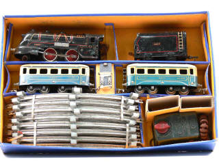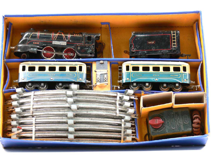 contient : une locomotive à vapeur type 120 aérodynamique (en état 'D' & en partie transformée) avec tender, 2 voitures de voyageurs PULLMAN, un transformateur n°5838, une fiche d'alimentation, 8 rails courbes, une fiche de garantie datée de septembre 1955 (non conforme au coffret) & une notice - traces d'oxydation sur les rails - carrosseries poussiéreuses