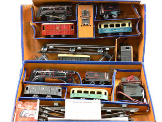 contient : une locomotive à vapeur type 020 (en état 'F') avec tender, une voiture de voyageurs PULLMAN, un wagon-fourgon à bagages', un transformateur type 5838, 4 rails courbes, 2 rails droits, une notice & une fiche de garantie - quelques traces d'oxydation - carrosseries poussiéreuses