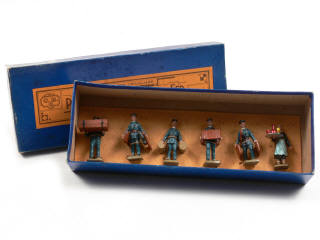 contient : 5 employés portant différents bagages & une femme avec un plateau - sur socle de présentation avec ficelle de maintien
