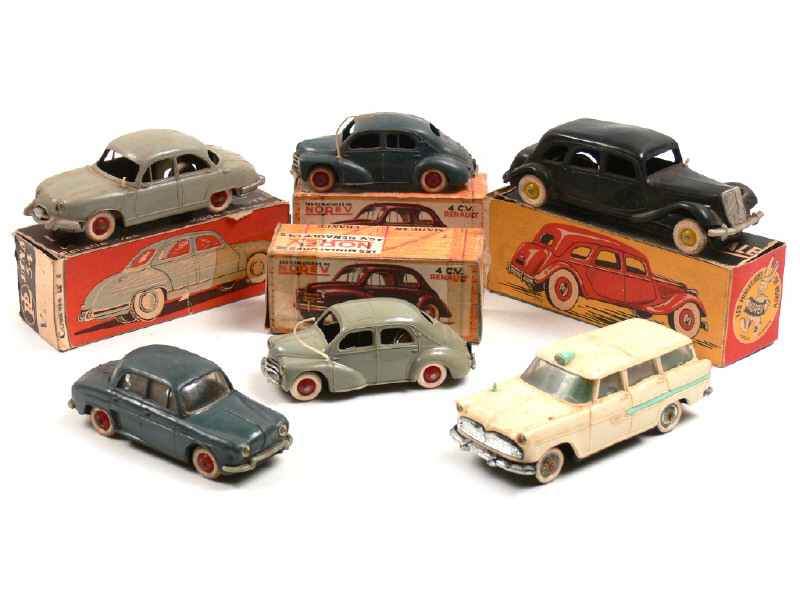 états de 'C' à 'F' - miniatures reproduisant les modèles : CITROËN, SIMCA, PANHARD & RENAULT - carrosseries encrassées - petits manques - 4 voitures en boîte (états de 'c' à 'e')