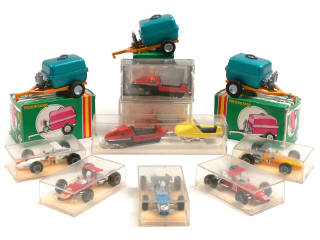 états de 'A' à 'C' - miniatures reproduisant les modèles : LOTUS-FORD, Mc LAREN, HONDA, MATRA & FERRARI - on y retrouve les marques : CHAMPION, MAJORETTE & JOAL (4 pneus non d'origine) - boîtes états de 'b' à 'c'