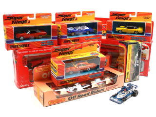miniatures reproduisant notamment les modèles : CHEVROLET, DODGE, PLYMOUTH, OLDSMOBILE, TYRRELL & JEEP - on y retrouve les marques : MATCHBOX, CORGI TOYS & MAJORETTE - 3 boîtes en état 'c' - manque une figurine