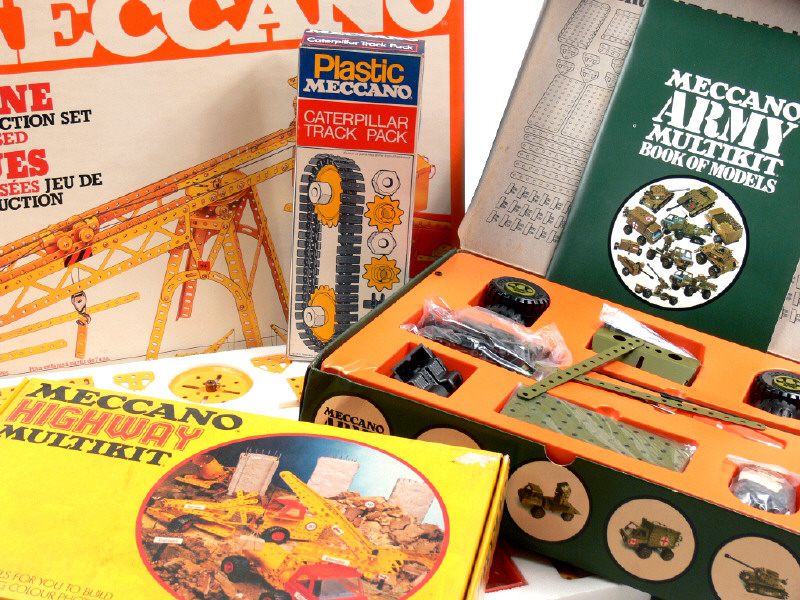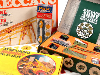 fabrication des années 1970 à 1990 - comprend : ARMEE 100, ARMEE 200 (avec 2 manuels d'instructions), GRUE MOTORISEES (avec manuel d'instructions & planche de décalques), ARMY MULTIKIT (avec manuel d'instructions & planche d'autocollants), TRAVAUX PUBLICS 200 (sous film plastique jamais ouvert) & HIGHWAY MULTIKIT (avec manuel d'instructions) - on y joint 2 boîtes de chenilles & galets avec notices
