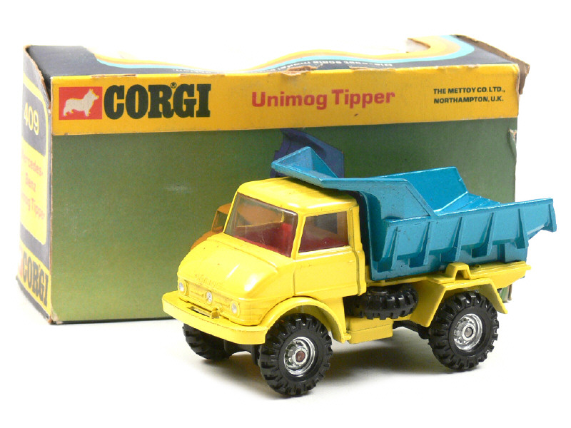 CORGI TOYS (GB) 409 MERCEDES UNIMOG 406 Benne basculante jaune citron, benne bleue