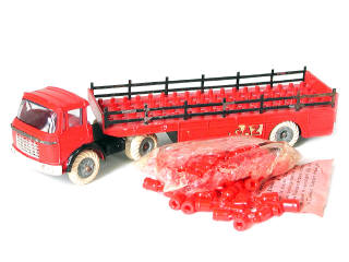 2 décalques en état 'A' & un autre incomplet - absence de chrome sur le bandeau BERLIET de la cabine - traces d'oxydation sur les axes de roues & les barrières - avec ses 90 bouteilles (complètes avec anses), sachet & notice