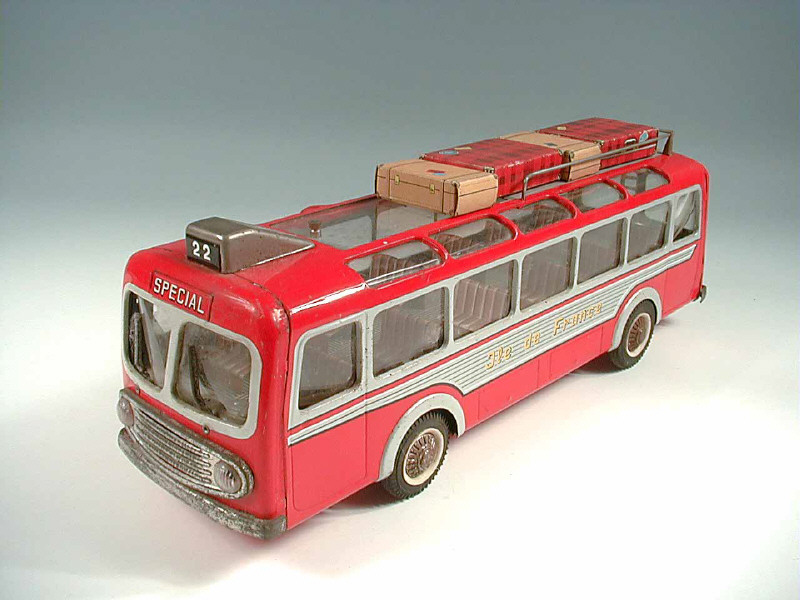 en tôle lithographiée - longueur 39 cm - moteur à friction (fonctionne) - en mouvement, les essuie-glaces fonctionnent - toit ouvrant - avec 4 valises en carton - traces d'oxydation