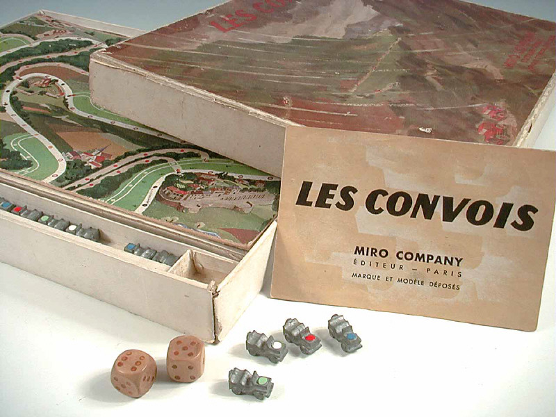jeu de société diffusé en 1946 - comprend : vingt jeeps en plomb avec pastilles de couleur, deux dés en bois, planche de jeu renforcée & régles du jeu - dimensions 38 x 29 cm - ILLUSTRATIONS SUPERBES !