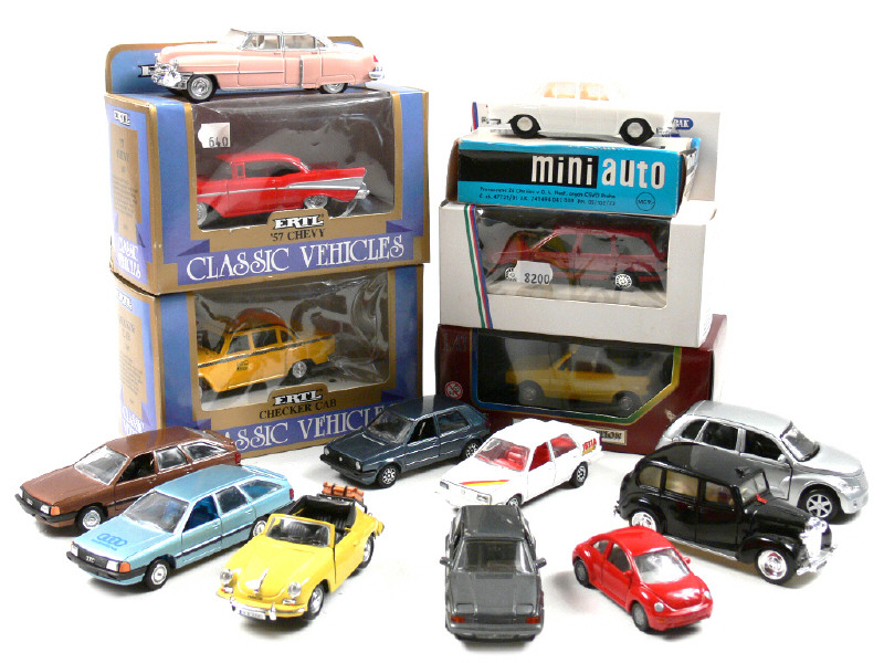 états de 'A' à 'C' - miniatures reproduisant les modèles : AUDI, AUSTIN, CHRYSLER, CADILLAC, CHECKER, CHEVROLET, PORSCHE, SKODA, VOLKSWAGEN & VOLVO - on y retrouve les marques : ERTL, SCHABAK, SCHUCO, SIKU, AHC MODELS, ROAD LEGENDS, MAISTO & MINI AUTO - 5 véhicules avec boîte