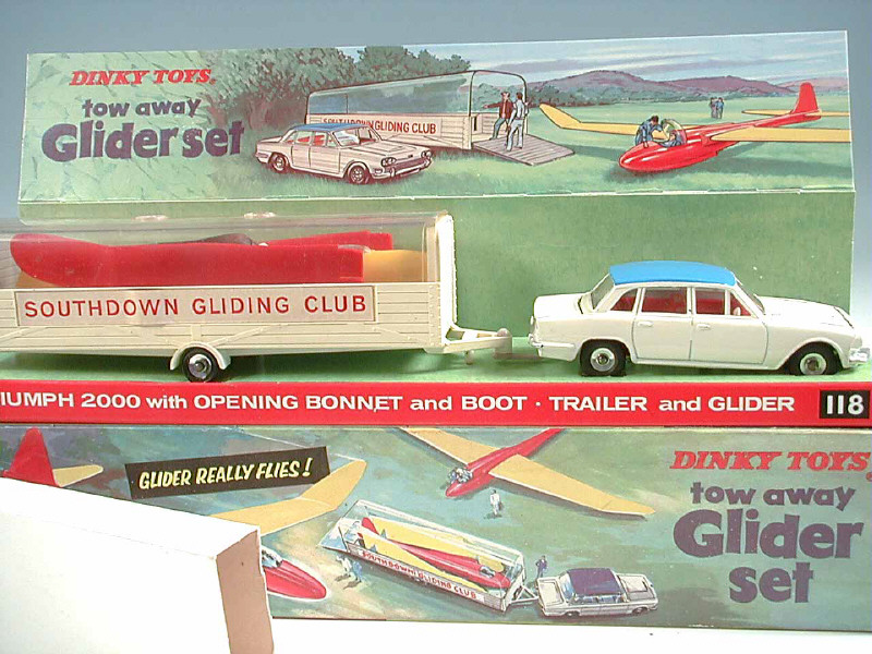 DINKY TOYS (GB) 118 TRIUMPH 2000 & Remorque avec planeur crème, toit bleu