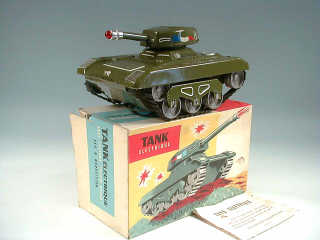 longueur 24 cm - moteur à piles (fonctionne) - jouet en métal décoré avec système 'non-stop' permettant à ce tank de changer automatiquement de direction, dès qu'il rencontre un obstacle - une ampoule rouge à l'extrémité du canon avec bruiteur imite un feu à répétition - avec notice