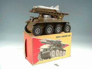 longueur 27 cm - moteur à clef (fonctionne avec bruiteur) - grâce à un système de ressort, les deux fusées sont éjectées sur leur rampe de lancement - manque deux ailettes - phares électriques