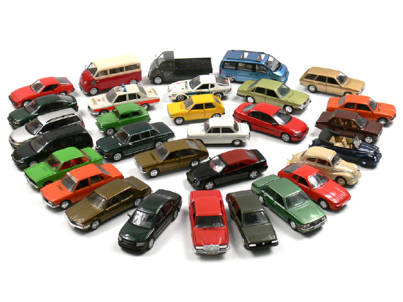 miniatures reproduisant les modèles : BMW, MERCEDES, DKW, AUDI, LLOYD, OPEL, PORSCHE, NSU & VOLKSWAGEN - 4 véhicules transformés - quelques petits éléments manquants