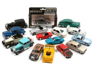 miniatures reproduisant les modèles : RENAULT (un véhicule en boîte), SIMCA, TRIUMPH, ROLLS ROYCE, CHRYSLER, OPEL, PORSCHE, MERCEDES, PEUGEOT, MATRA SIMCA, BMW, TALBOT MATRA, ALFA ROMEO, TALBOT SIMCA & ALPINE - quelques petits manques - certaines voitures transformées - une BMW de la marque LEADER