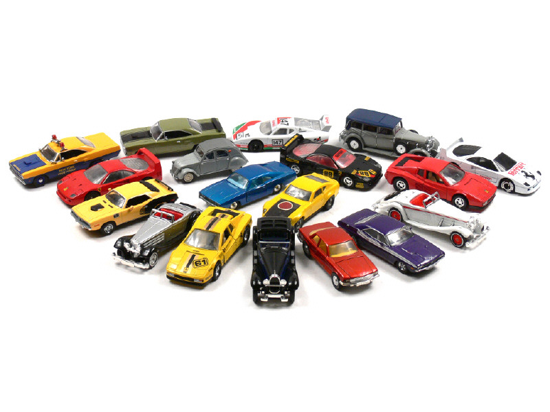 miniatures reproduisant les modèles : FERRARI, MERCEDES, PLYMOUTH, DATSUN, BUGATTI, DODGE, NISSAN, ROLLS ROYCE, LAMBORGHINI & CITROËN - une voiture de la marque DINKY-MATCHBOX - 2 véhicules transformés - quelques petits manques