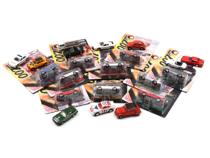 petites échelles - miniatures reproduisant notamment les modèles : ASTON MARTIN, FORD, LOTUS, TOYOTA, VOLKSWAGEN, CITROEN, FERRARI, PORSCHE, JAGUAR, RENAULT & SUNBEAM - 10 voitures de la série 'JAMES BOND' sous blister jamais ouvert