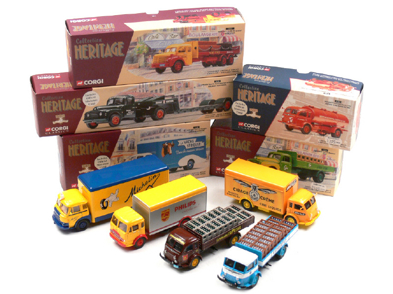 série 'HERITAGE' - comprend : CITROEN P55 fourgon 'VACHE SERIEUSE', BERLIET GLR8 brasseur 'VINI-PRIX', CITROEN P55 semi-remorque surbaissé 'BOURGEY MONTREUIL', RENAULT FAINEANT citerne d'incendie du Var, CITROEN P55 brasseur GINI, RENAULT FAINEANT brasseur 'VICHY ETAT', RENAULT FAINEANT brasseur 'DUMESNIL', SAVIEM JL20 fourgon 'MICHELIN', RENAULT FAINEANT fourgon 'ABEILLE' & SIMCA CARGO fourgon 'PHILIPS' - 5 véhicules avec boîte