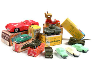 miniatures reproduisant les modèles : FORD, AMX, MERCEDES, JEEP, CITROËN, M8, CITROËN, PEUGEOT & RENAULT - on y retrouve les marques : CHARBENS, E.K.O, NOREV & CADUM PAX - 3 véhicules sans boîte - 2 boîtes en état 'd'