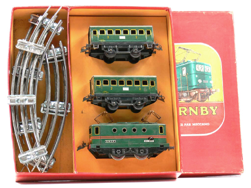 contient : une motrice électrique BB-8051 (moteur à clef fonctionne, parties nickelées oxydées), 2 voitures de voyageurs de 2ème classe & 6 rails courbes (électriques & non d'origine)
